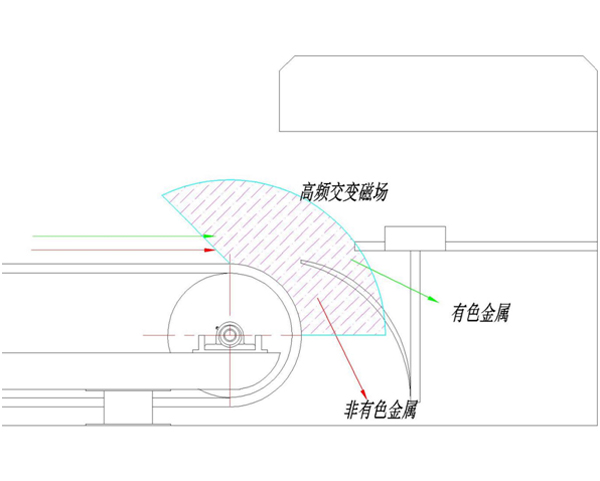 渦電流分選機也叫有色金屬分選機,它是由環(huán)形輸送皮帶、內(nèi)部磁芯輥、外部磁輥筒等組成。渦流內(nèi)部磁芯輥所內(nèi)置磁極高速旋轉(zhuǎn),從而磁場呈高頻變化,磁場的高頻變化促使有色金屬碎片中產(chǎn)生極強的渦流,渦流所產(chǎn)生的磁場與外部磁場之間相互作用,促使有色金屬碎片從原有物料流中分離。
