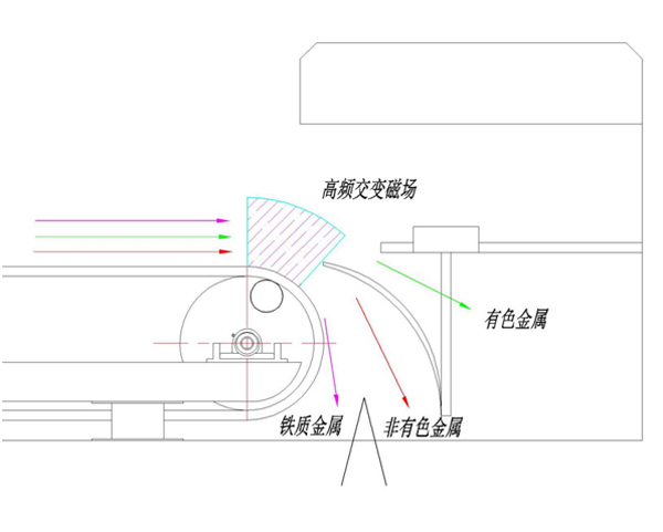 渦電流分選機分為同心式和偏心式有色金屬分選機,其工作原理為:作用磁輥筒包括一個外部滾筒、一個內(nèi)部磁芯輥、磁芯輥驅(qū)動電機。渦流分選機開啟后,內(nèi)部磁芯輥高速運轉(zhuǎn),環(huán)形皮帶上物料中的有色金屬在高頻交變磁場里產(chǎn)生感應(yīng)電流,此電流而產(chǎn)生的磁場同原磁場方向相反,故對有色金屬產(chǎn)生較大的排斥力(洛倫茲力),將有色金屬瞬間從物料中彈出,實現(xiàn)分離目的。根據(jù)畢奧-薩伐爾定律,有色金屬感應(yīng)面越大,相應(yīng)的排斥力也越大,越利于分選。渦流分選機通常與其它分選設(shè)備相配合,實現(xiàn)高純度、高品質(zhì)的再生回收產(chǎn)品。
